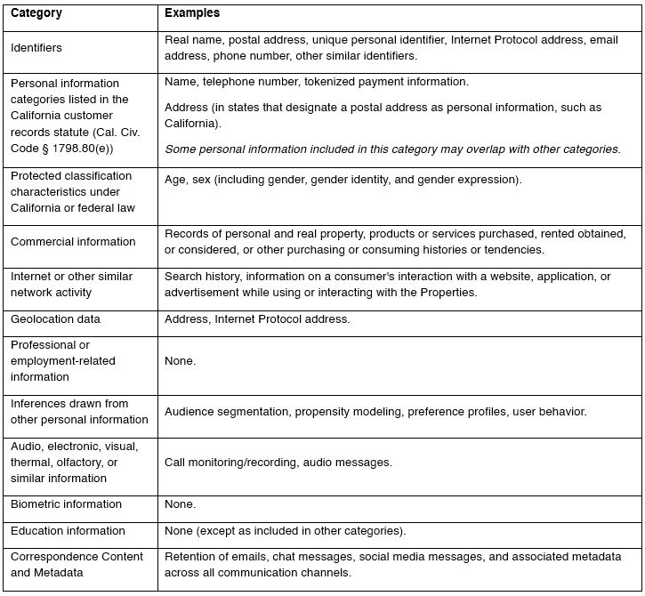 Categories of Personal Information Collected