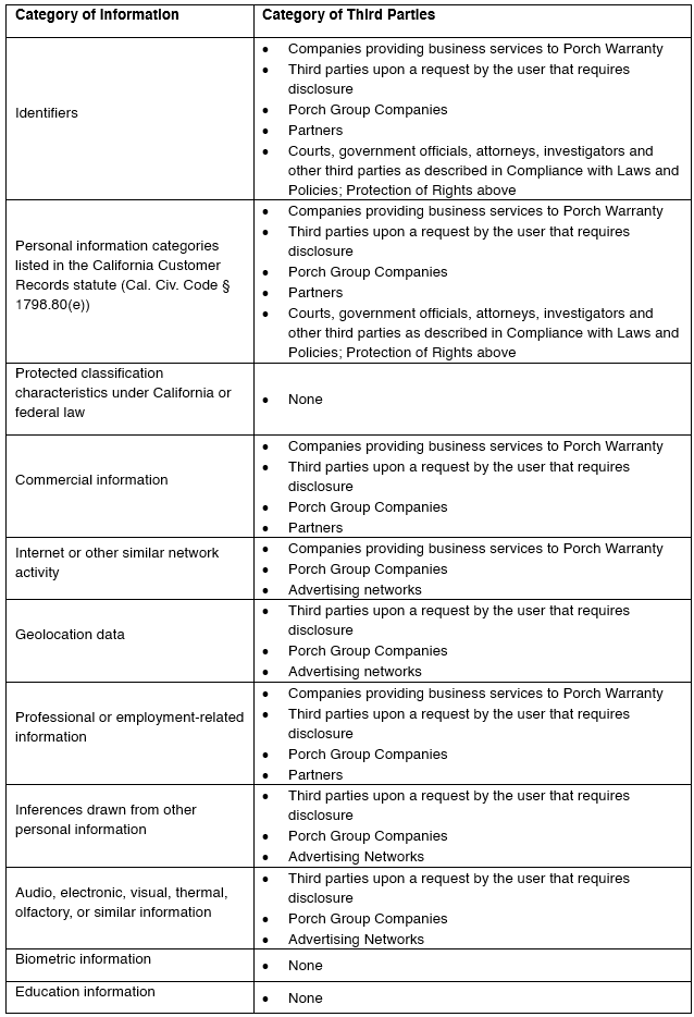 In the last twelve (12) months, Porch Warranty has disclosed the following categories of personal information for a business purpose to the following categories of third parties: